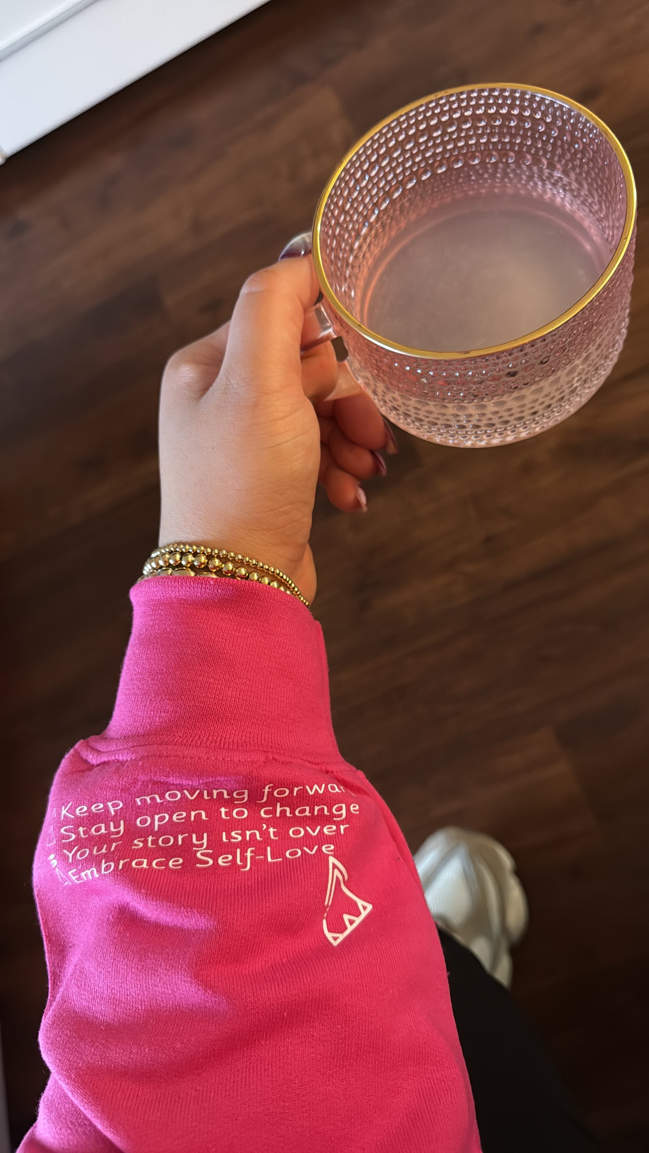 - Left Sleeve: Keep Moving Forward • Stay Open to Change • Your Story Isn’t Over • Embrace Self-Love
